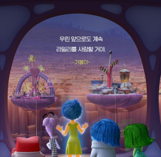 • 감정들 외에 기억 섬, 성격 성, 가족 기막기, 상상 랜드 등 내부 공간도 일종의 캐릭터로 기능하며 라일리의 내면과 정체성의 공간적 표현을 풍부하게 만든다.