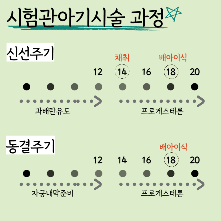 - 수정 및 배양: 체외에서 정자와 난자를 수정시키고 일정 기간 배양합니다.